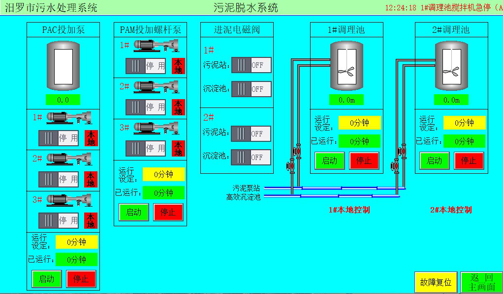 集信號控制整個污水處理廠的污泥脫水系統(tǒng)自動控制。各設(shè)備通過采集設(shè)備信號做出運行與保護判斷,同時具有就地控制與遠程控制。每臺設(shè)備的供電系統(tǒng)出現(xiàn)故障都會報出相應